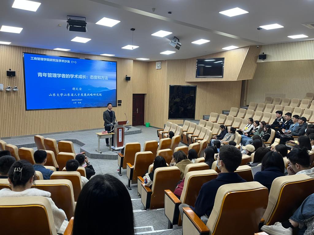 研究生学术沙龙启动仪式暨首期学术报告在逸夫楼103报告厅举行。本次活动特邀山东大学山东省人才发展战略研究院党支部书记、副教授胡文安,以《青年管理学者的学术成长:态度和方法》为主题进行首期学术分享。仪式由学院党委副书记彭艳红主持,研究生辅导员刘薇、任康以及全体研究生参加。