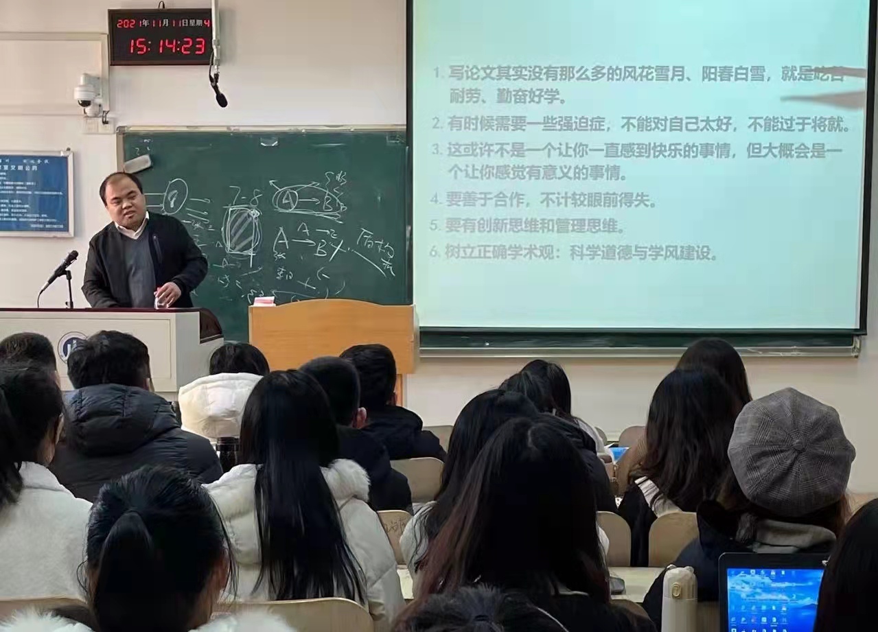 徐鹏围绕“研究生如何及时完成角色转换、什么是科学研究、科研论文的撰写与研究能力提升、科学道德与学术规范”等方面展开讲解。在谈到如何选择合适的论文题目时,他强调了以下几点:首先,选题要在可行性与创新性之间达到一个平衡;其次,可以选择一个问题进行透彻分析;最后,围绕热点问题进行研究,内容需具备实施实证研究的基础和可行性。随后针对文献综述给同学们提供了一些建议:文献综述不仅仅是简单的文献列举,更重要的是梳理清楚与研究主题的关系,引用文献要有一定的逻辑性。