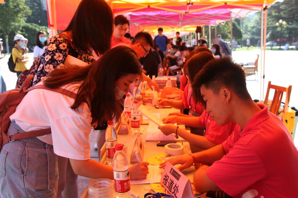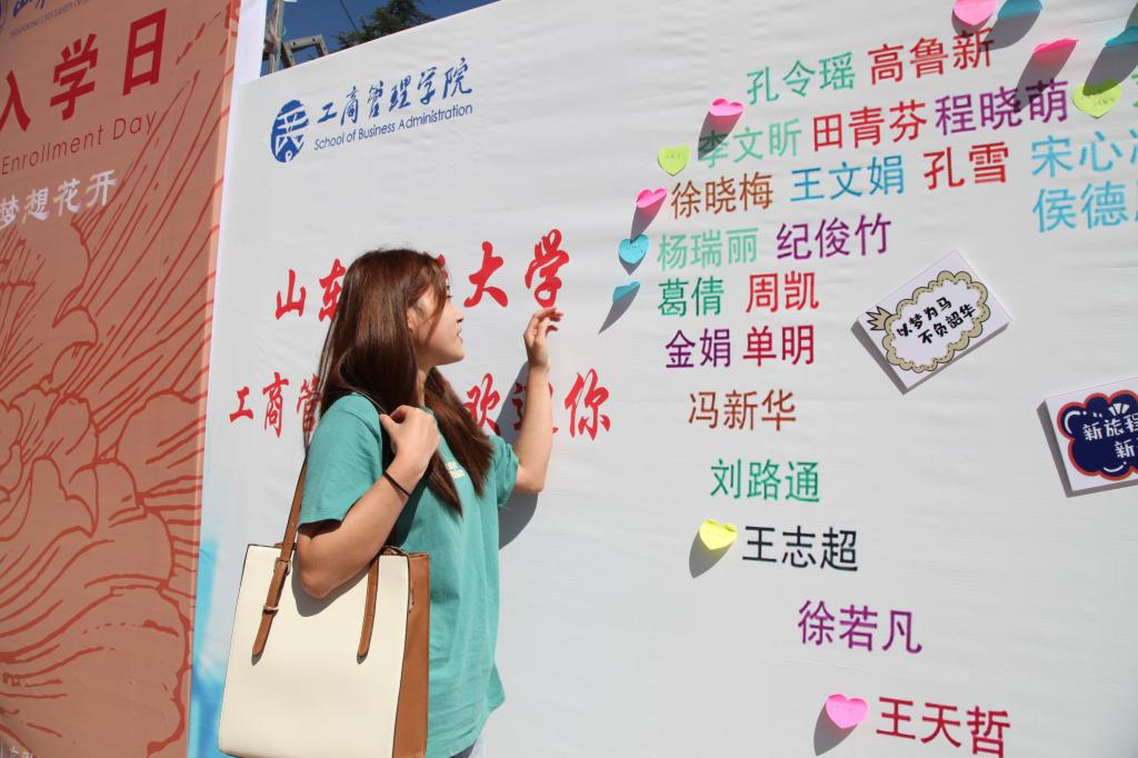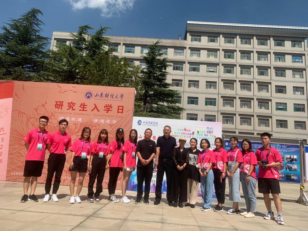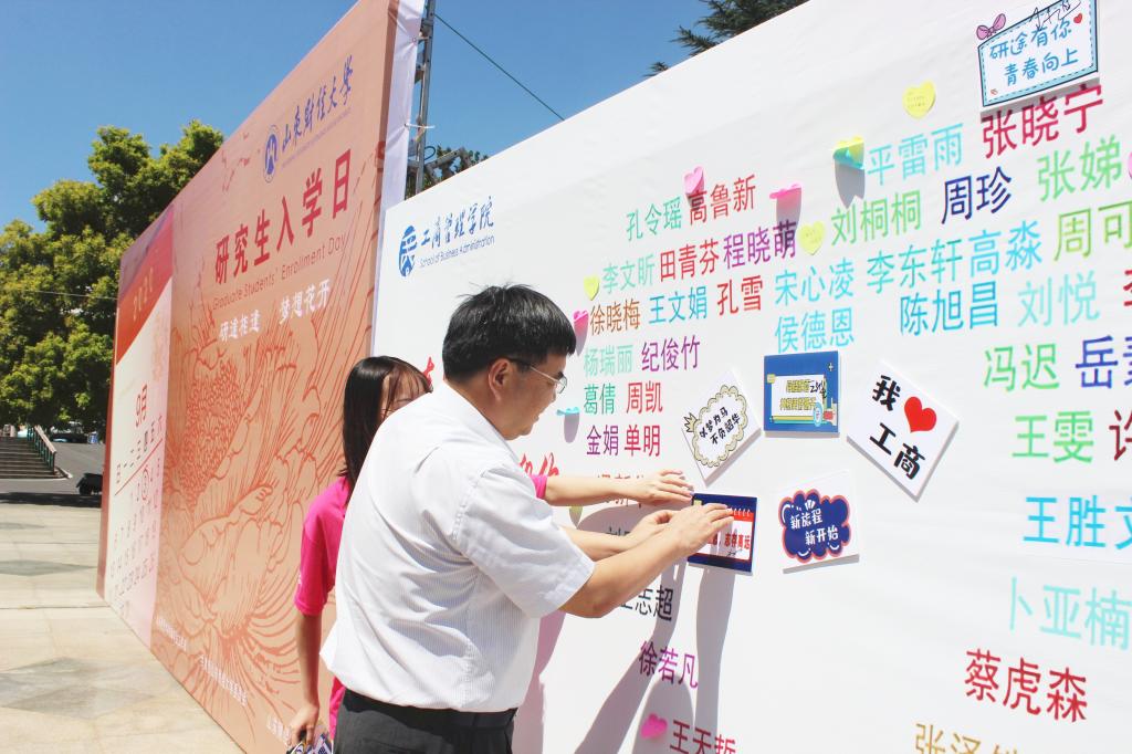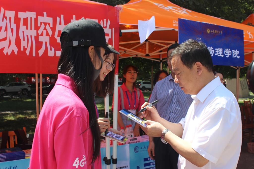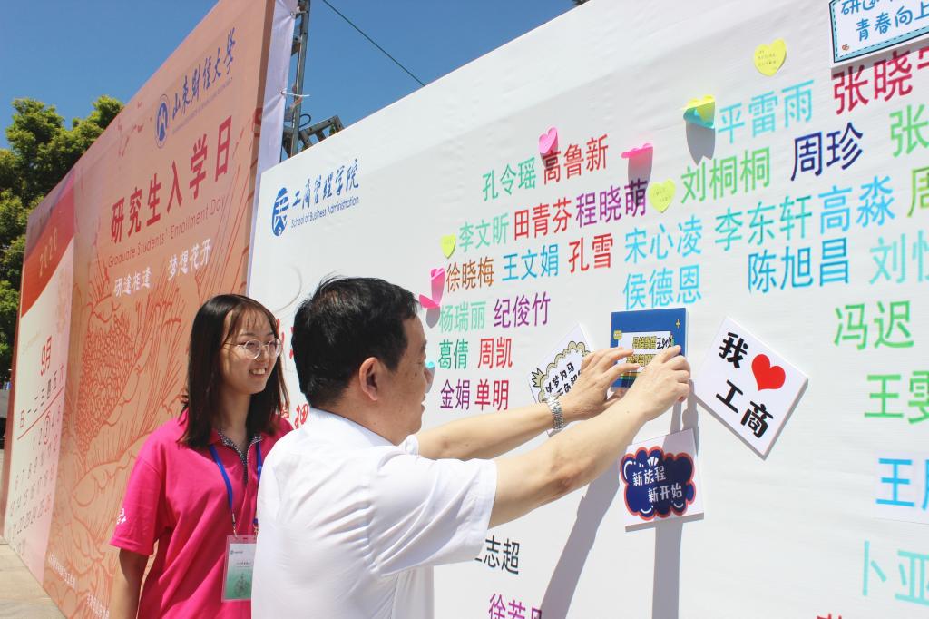 迎新现场,亲切地和研究生新同学交谈,慰问参加迎新工作的志愿者,并将签名的祝福语板贴到学院的新生祝福墙上,现场同学深受鼓舞,在场的研究生新同学和志愿者一起和领导老师合影留念。