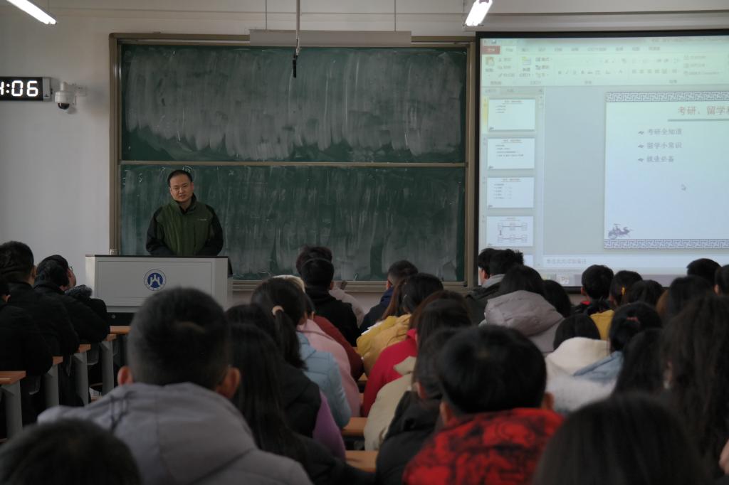 刘侠向同学们详细地介绍了研究生的学位分类、全日制和非全日制以及学硕和专硕的区别,让同学们对什么是研究生有了更加清晰的了解。随后,针对为什么要考研,刘侠表示“个人素质提升的需要”、“职业发展的需要”以及“为了缓期毕业明确去向”为同学们考研的三个主要原因。对于怎样准备考研,刘侠认为组织安排时间是成功的唯一法宝,同学们应积极参与学校组织的大型实践活动,抓住所有机会增长自己的实践经验。最后,刘侠表示,扎实的专业技能、必要的证书以及找工作的技巧是大学生就业的三个重要方面。