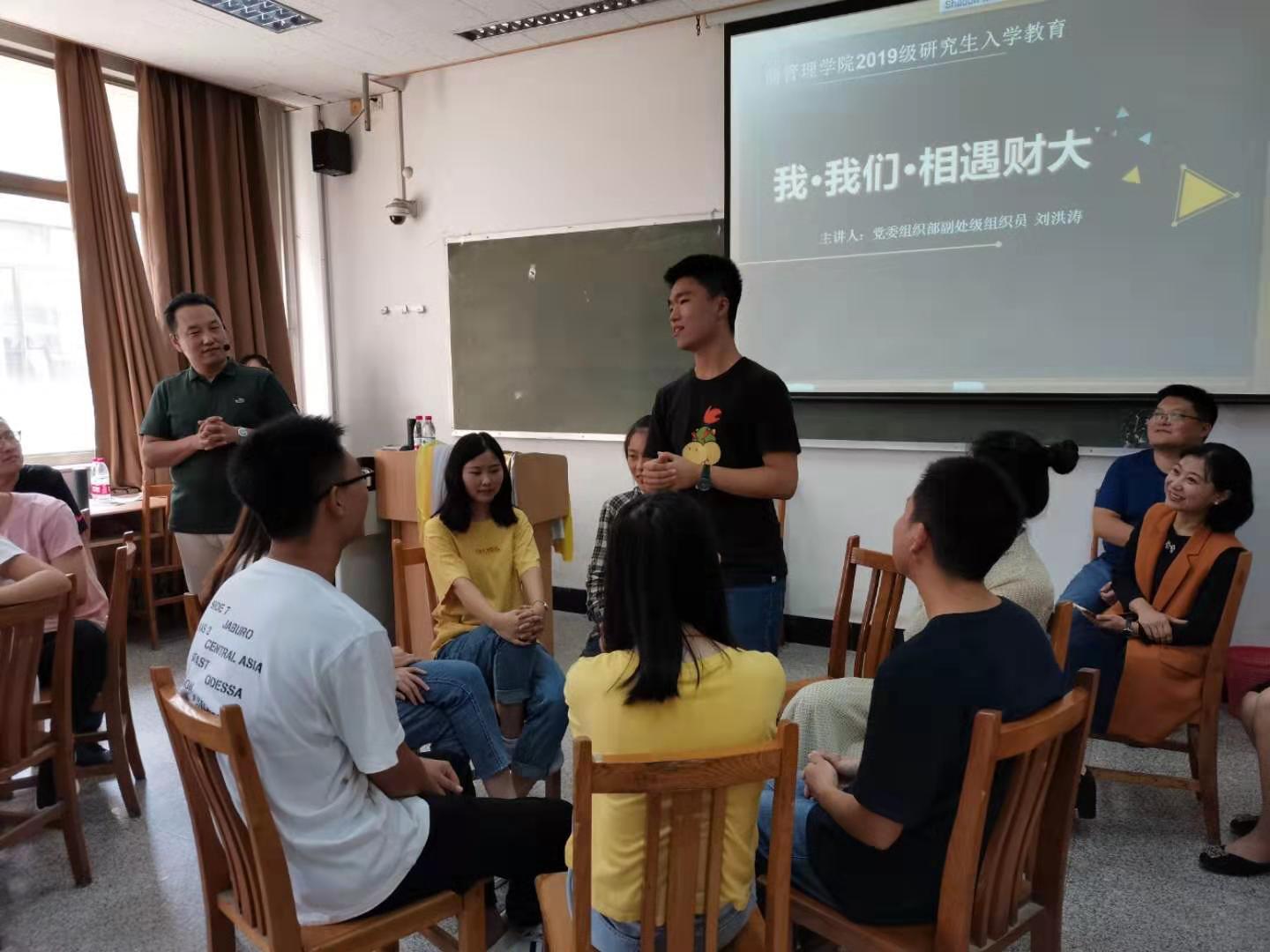 2019级研究生入学团体心理辅导在2号教学楼2208教室举行。本次活动以“我 我们 相遇财大”为主题,旨在促进2019级研究生互相熟悉,深入了解,激发团体动力,促进团队建设。学校党委组织部副处级组织员、国家二级心理咨询师刘洪涛应邀带领活动,学院党委副书记彭艳红、研究生辅导员尤泽民以及2019级全体研究生参加。