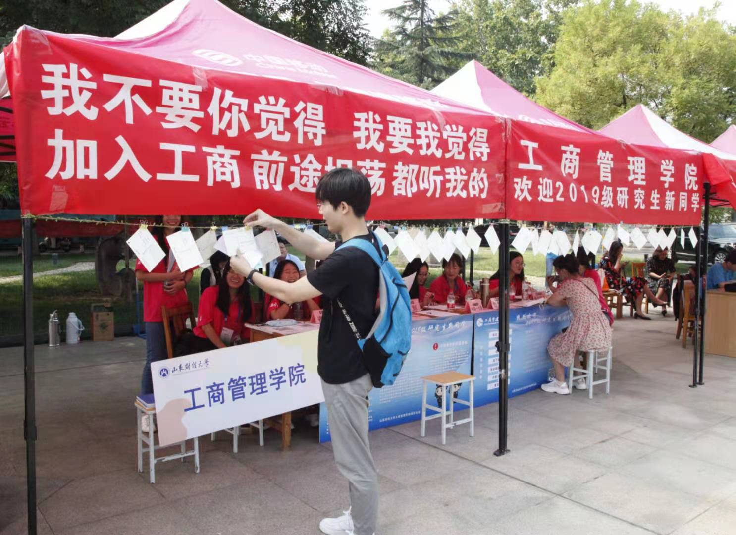 在前期专门召开迎新工作会,商讨迎新工作的具体细节。9月5日上午,迎新工作正式开始。迎新志愿者提前对报到现场进行布置,并充分利用展板对学院研究生基本情况以及报到流程等内容进行展示。新生报到共分为七个流程:验证资格审查、提交材料、领取相关材料、“”明信片、在签名墙签名、按下手印,每个环节都配备工作人员加以引导。报到期间,学院党委书记李旭刚、院长刘军、党委副书记彭艳红亲临迎新现场,与新生展开亲切交谈。在“时光寄语”环节,每位新生在明信片上写下对自己未来三年的寄语,2019级新生陈晓昀就写到:宝剑锋从磨砺出,梅花香自苦寒来,这一句简单的话语体现了她深知成为一名研究生的不易,以及在未来砥砺前行的决心。