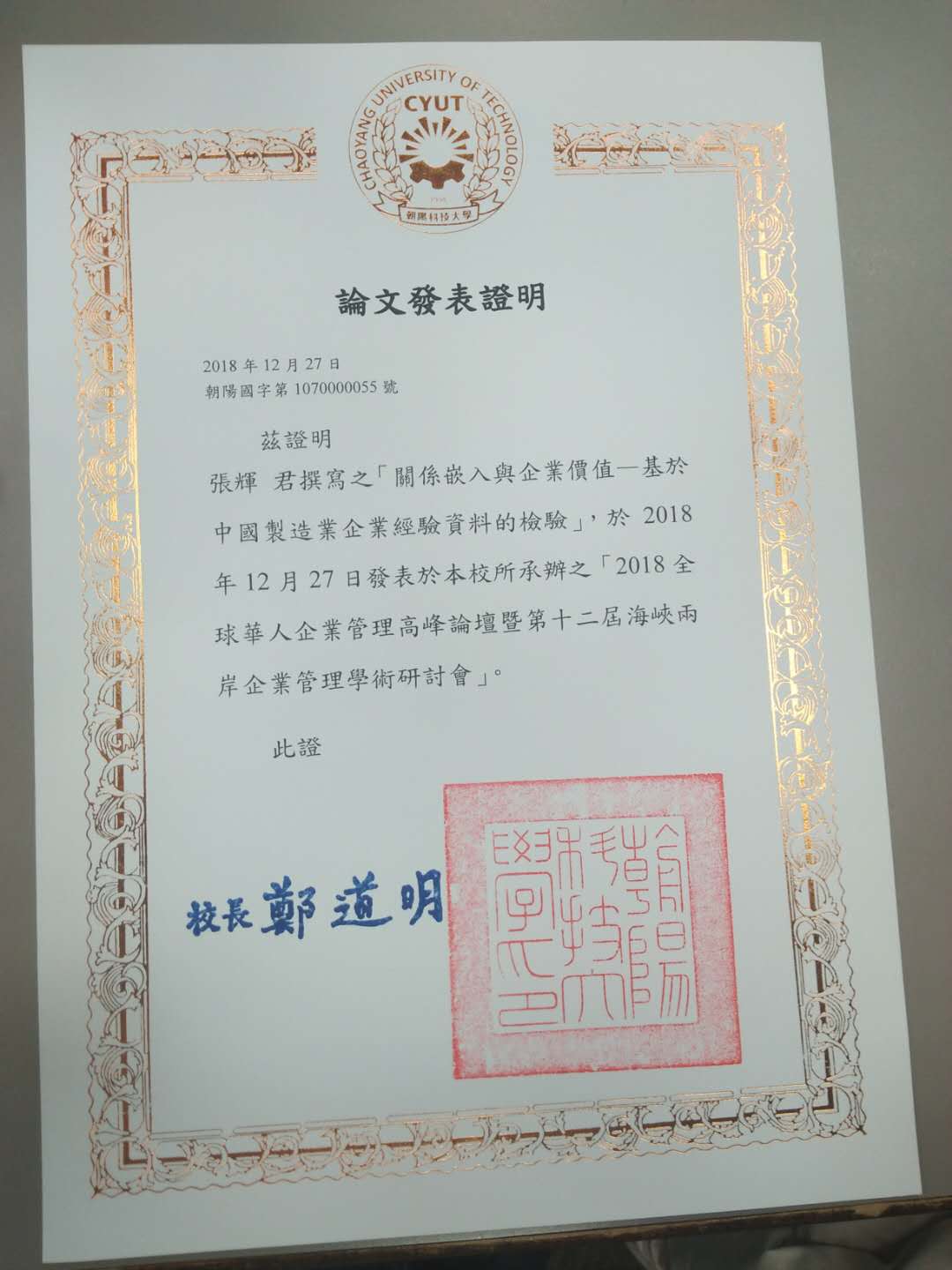 张辉同学于2018年12月26日-30日赴中国台湾朝阳科技大学参加“2018全球华人企业管理高峰论坛”,该论坛每年举办一次,是海峡两岸重要的学术沟通平台。本次论坛的主题是“智慧时代的企业创新”,分设了创新模式、组织创新与人资管理、行销管理、流通管理、金融科技、休闲管理、旅游管理、东方管理、电商管理、科技管理及其它有关议题。交流会上,张辉同学就申请并参加的做爱影片