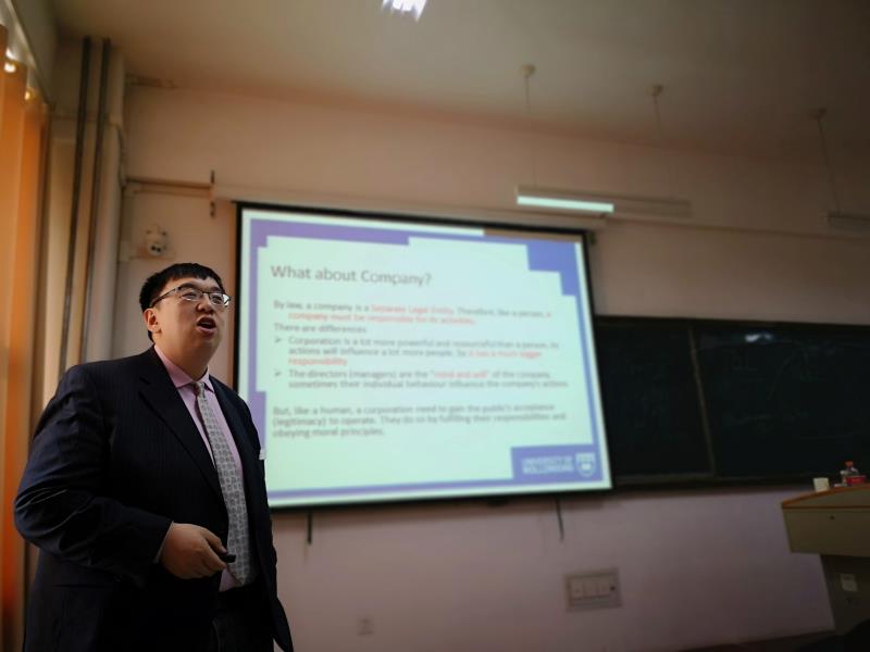本学期是该课程实施我校国际交流与合作处课程国际化项目的第二年,由来自澳大利亚伍伦贡大学的Tairan Kevin Huang(黄泰然)博士在为期六周的时间里开展双语课程讲授。基于前期中方老师的理论铺垫,黄老师采用案例教学法,从全球化与商业伦理、消费伦理、环境与商业伦理、雇员与商业伦理等多领域与同学们探讨了现实中的商业伦理问题。通过课前小组阅读全英文案例,提高了同学们的英语水平;通过小组讨论,提高了同学们的合作意识与协调能力;通过案例解析及英文PPT展示,锻炼了同学们的逻辑思考能力和演讲能力。每次课上学生案例分析展示后,黄老师从演讲技巧和演讲内容两方面帮助同学们进行分析与提升,并结合国内外前沿理论进行案例的深入分析,这个过程有效打破了学生的思维定式、进一步丰富了学生的思想及视野、提高了学生的思辨能力。最后一次课上,黄老师对于法律与伦理交集与分集的阐述、各种道德哲学观的总结,以及通过私德引申到企业的社会责任等方面的讲授,进一步明确了本课程的主旨及内涵,加深了学生对商业伦理的理解。