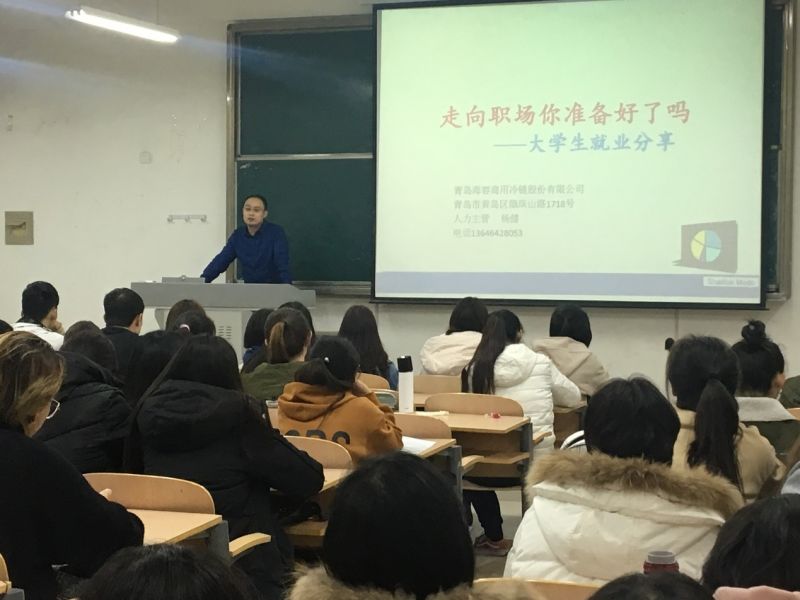 讲座伊始,杨健介绍了青岛海容商用冷链股份有限公司的概况,其后,就当前就业形势和公司人才需求情况进行专业分析,并从职业技能、职业素养、积极心态三个方面生动形象地展开讲解。杨健指出,面对当下严峻的就业环境,要提前做好职业规划,找准就业方向,积极储存知识技能,为之后的工作实习打下坚实基础。